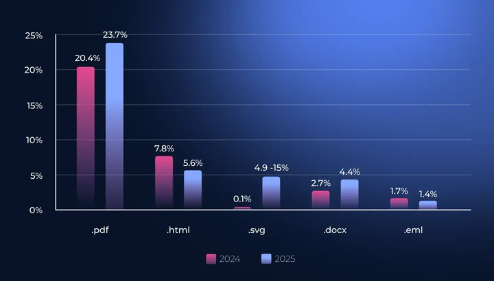 However, in 2025 - while still behind the PDFs - SVGs are the most popular and versatile file type. SVGs have almost caught up to HTML files and surpassed DOCX-files. By the beginning of July of 2025 SVG files made up 4.9% of all observed attachment-based phishing, and March 2025 saw a peak of a whopping 15% (Figure 1).