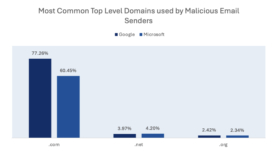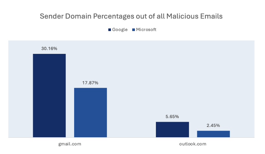 The most common sender domain that malicious emails came from was “gmail.com”, and the second most common was “Microsoft Outlook Personal Email and Calendar | Microsoft 365 ” in both environments.