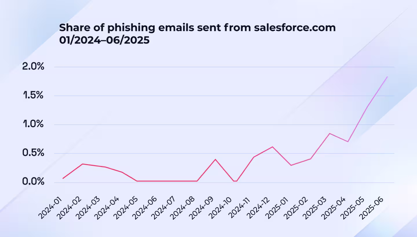 Since late 2024, threat actors have increasingly used Salesforce’s mailing services, often using [email protected]. More recently, campaigns have evolved to leverage the Salesforce Marketing Cloud, expanding delivery methods beyond traditional transactional senders. Salesforce’s share of sender domains among malicious emails rose from 0.6% in January to 1.8% in June (Figure 18).